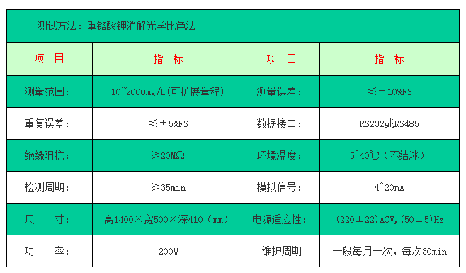 适于化学需氧量在 10~2000mg/L 范围内且氯化物浓度低于 2.5g/L Clˉ的废水, 根据用户实际要求,可以适用于氯化物浓度低于 20g/L Clˉ的废水。
